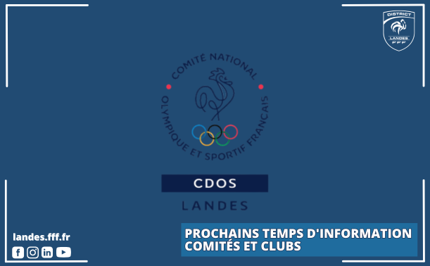 Le Comité Départemental Olympique et Sportif des Landes (CDOS 40) organise plusieurs temps d’information à destination des clubs et comités du territoire. Gratuits et ouverts à toutes et tous, ces rendez-vous ont pour objectif d’accompagner les structures sportives dans leur fonctionnement et leur développement.
