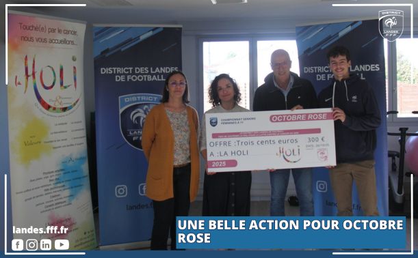 Le week-end du 18 et 19 octobre 2025 marquait une nouvelle journée de championnat pour la compétition Seniors Féminines à 11. Dans le cadre d’Octobre Rose, le District des Landes de Football a une nouvelle fois collaboré avec l’association La Holi afin de soutenir la lutte contre le cancer du sein.